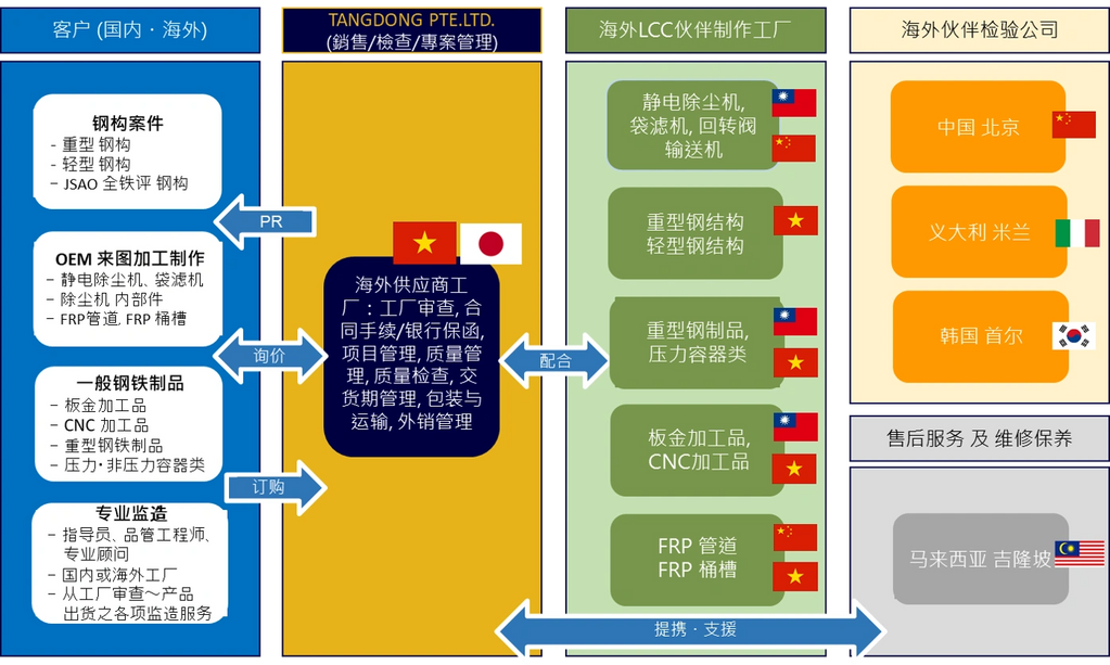 依照客户之需求,介绍及推荐海外LCC (低成本生产国) 之工厂,提供: 一般钢铁制品 / 钢结构 / 压力容器, 非压力容器等产品。